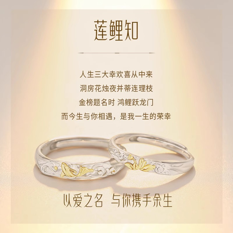 莲鲤知情侣对戒S925纯银戒指开口一对小众设计男女手饰情人节礼物